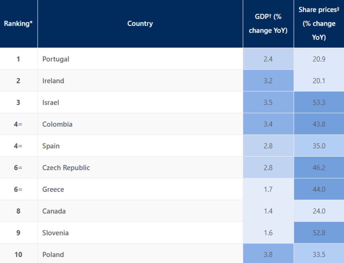 Po lanskem prvem mestu Španije je letos na vrhu seznama Portugalska, ki je združila nadpovprečno gospodarsko rast, nižjo inflacijo in zelo uspešen borzni trg. Visoko so se uvrstile tudi nekatere druge države evrskega območja, ki so se še pred desetletjem soočale z globokimi krizami – med njim tudi Grčija na šestem mestu.