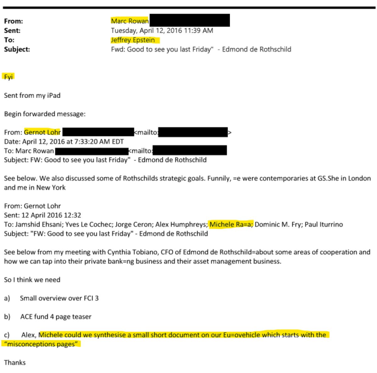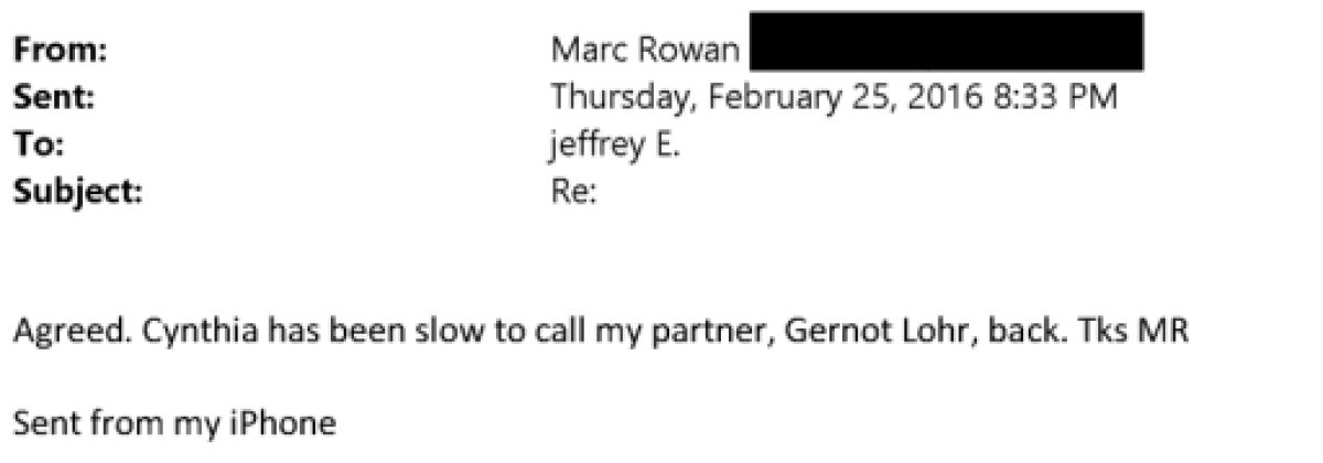 Epstein v tej verigi očitno ni bil le pasiven opazovalec, prav nasprotno, zdi se, da je vzpostavil stik med Rothschildovo banko in skladom Apollo. Poldrugi mesec pred omenjeno korespondenco, 25. februarja 2016, mu je namreč Rowan poslal sporočilo, da se "Cynthii ne mudi s klicanjem mojega partnerja Gernota Löhra".