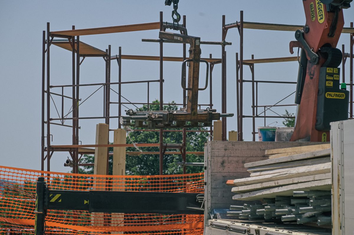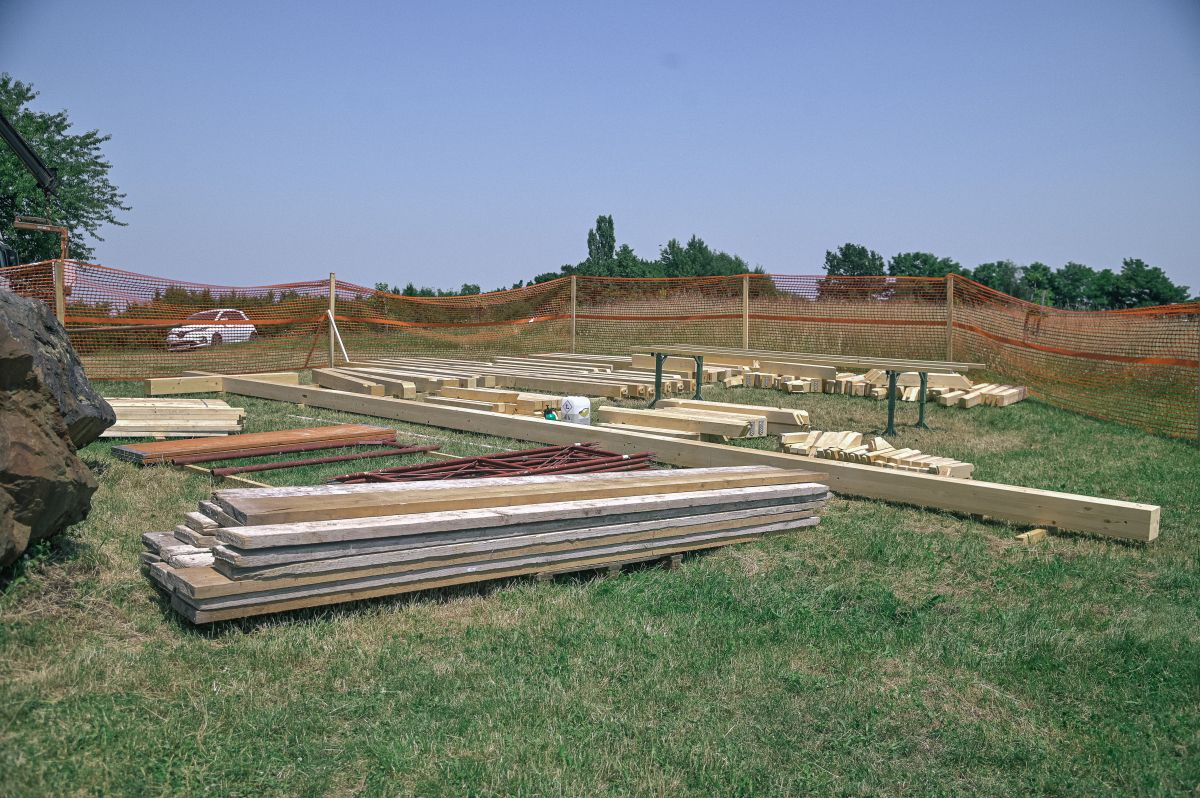 Leseni deli so bili na lokacijo prepeljani v ponedeljek, s postavitvijo stolpa so začeli danes.