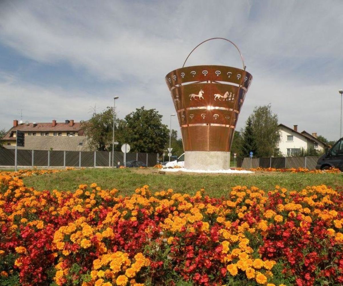 V krožišču v Bučni vasi so dopoldne postavili dolgo časa napovedovano bakreno skulpturo v obliki železnodobne situle, ki je nastala v sodelovanju mojstra stavbnega kleparstva Lada Rauha iz Uršnih sel in Šolskega centra Novo mesto.