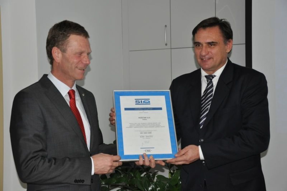 Družbi Kostak je direktor Slovenskega instituta za kakovost in meroslovje (SIQ) Igor Likar danes izročil certifikat za sistem upravljanja z energijo po standardu EN 16001:2009. Gre za prvi tovrstni certifikat v Sloveniji, v družbi Kostak pa po Likarjevih besedah predstavlja javno dokazilo o nadaljnji nadgradnji njihovega obstoječega, dobro delujočega in že skoraj sedem let certificiranega sistema vodenja, ki združuje sistem vodenja kakovosti, sistem ravnanja z okoljem ter sistem varnosti in zdravja pri delu.