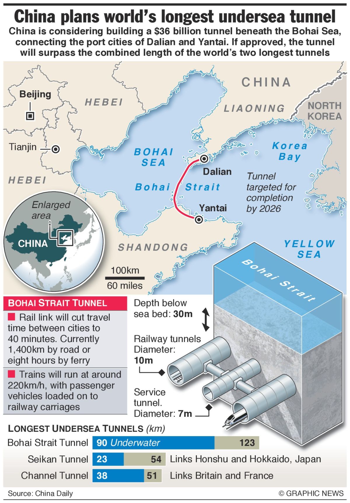 Predlogi o izgradnji tunela pod morjem Bohai, ki naj bi stal več kot 36 milijard ameriških dolarjev, bodo kitajski vladi predstavljeni v začetku aprila. Tunel naj bi v dolžino meril 123 kilometrov in s tem prekašal oba do sedaj najdaljša tunela na svetu – japonski Seikan tunel in tunel Channel, ki povezuje Francijo in Veliko Britanijo.