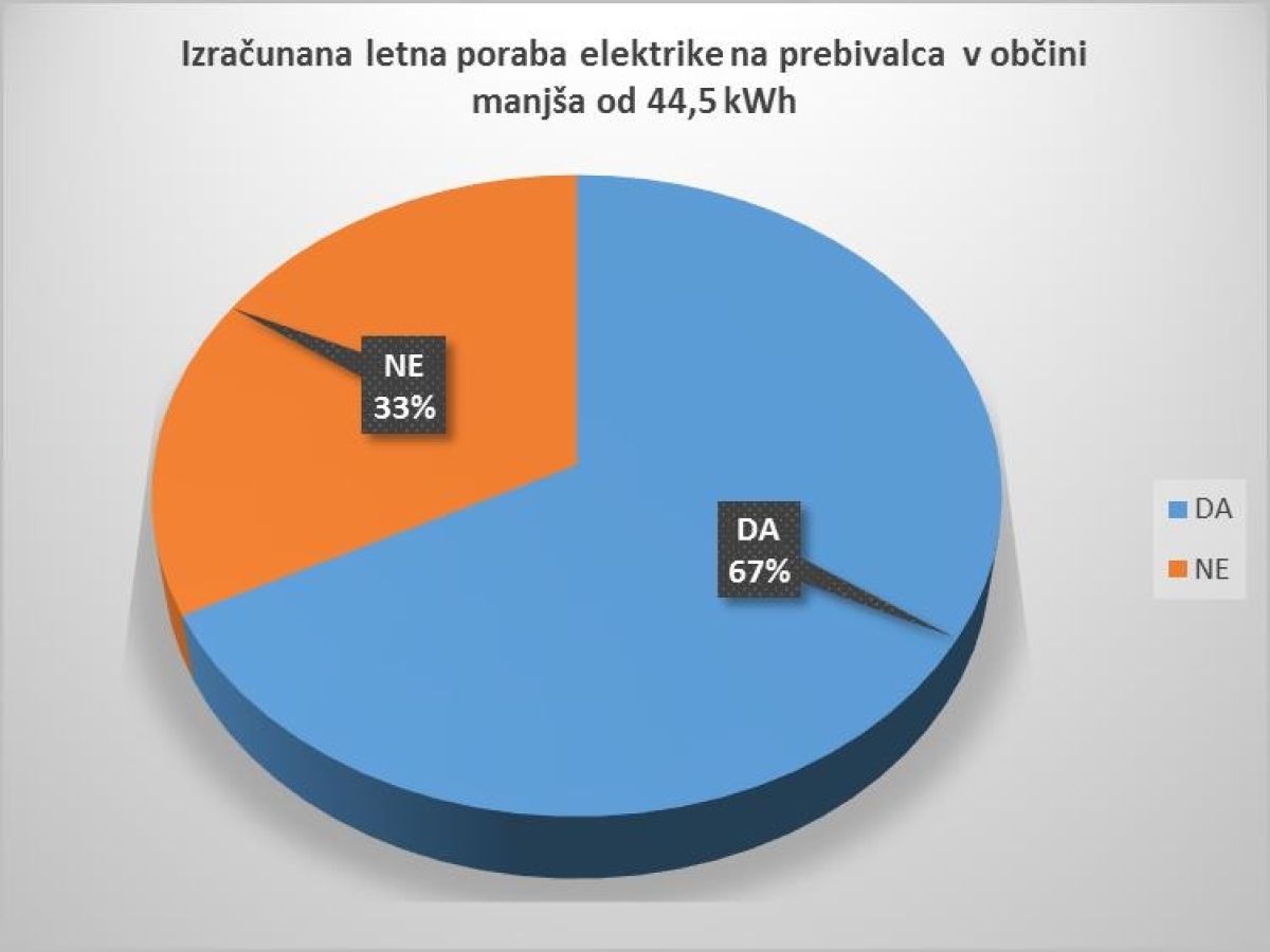 letna poraba elektrike vseh svetilk, ki so na območju posamezne občine vgrajene v razsvetljavo občinskih cest in razsvetljavo javnih površin, ki jih občina upravlja, izračunana na prebivalca s stalnim ali začasnim prebivališčem v tej občini, ne presega ciljno vrednost 44,5 kWh,