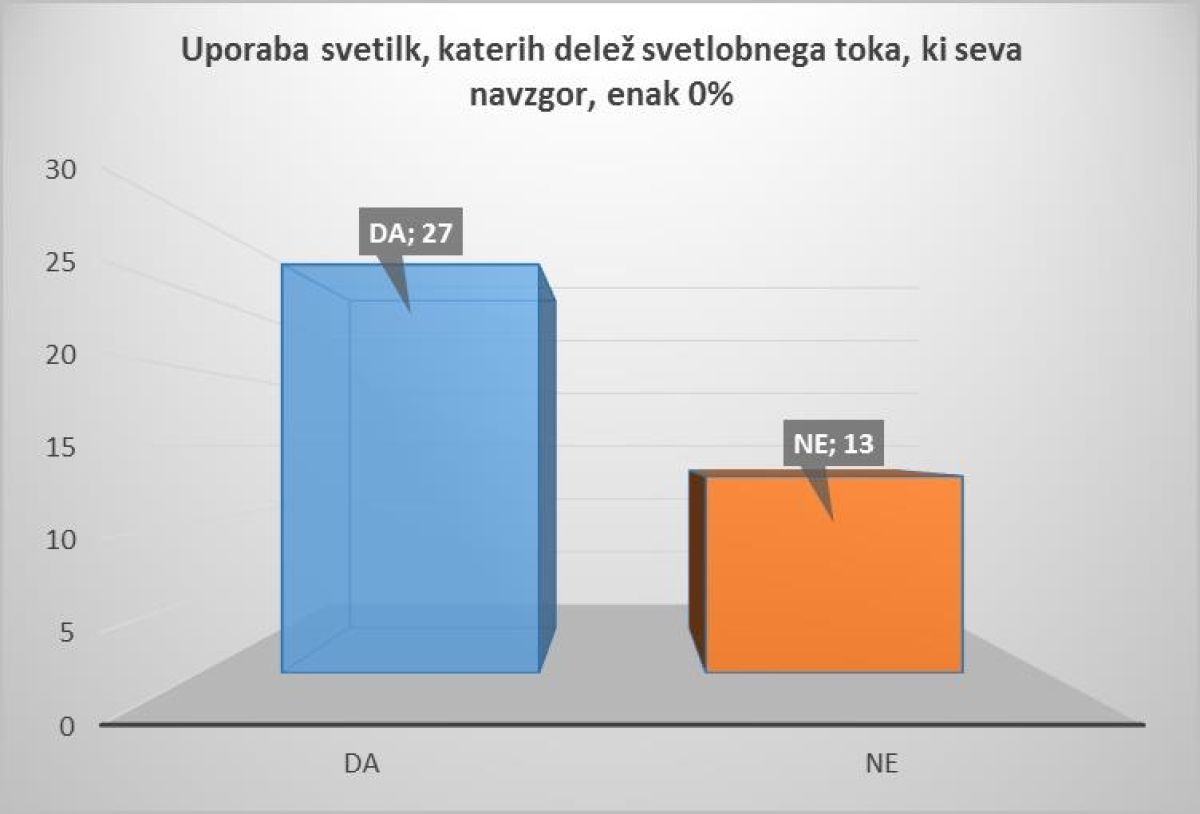Inšpektorji Inšpekcije za okolje in naravo Inšpektorata RS za okolje in prostor so pregledali 40 izbranih občin, po pet največjih iz vsake območne enote. Kar se tiče uporabe svetilk, katerih je delež svetlobnega toka, ki seva navzgor, enak 0 odstotkom, so ugotovili, da v 27 občinah uporabljajo navedene svetilke, v 13 občinah pa ne v celoti. V 27 občinah letna poraba elektrike vseh svetilk, ki so na območju posamezne občine vgrajene v razsvetljavo občinskih cest in razsvetljavo javnih površin, ki jih občina upravlja, izračunana na prebivalca s stalnim ali začasnim prebivališčem v tej občini, ne presega ciljne vrednosti 44,5 kWh, v 13 občinah pa jo presega. Vsi upravljavci razsvetljave javne površine v pregledanih občinah v dnevnem času od sončnega vzhoda do sončnega zahoda razsvetljavo javne površine ugašajo, razen v zelo slabih vremenskih razmerah, denimo v gosti megli, močnem dežju ali sneženju. Trideset občin ima izdelan načrt javne razsvetljave, od tega ga dve tretjini občin redno revidira. 28 upravljavcev razsvetljave javne površine in občin ima načrt razsvetljave objavljen na svoji spletni strani ali na drug primeren način, tako da je dostopen javnosti.