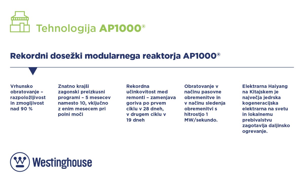 Eden Westinghousovih paradnih konjev je večji reaktor AP1000®, ki združuje preverjeno tehnologijo in inovativne pasivne varnostne sisteme ter omogoča proizvodnjo električne energije po konkurenčnih cenah. Seveda brez emisij toplogrednih plinov in dodatnega vpliva na okolje.