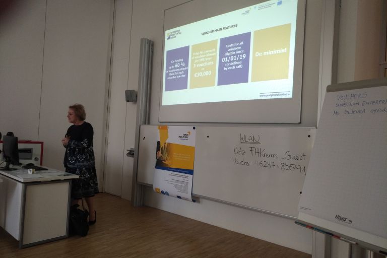 Regionalna razvojna agencija je skupaj s predstavnico Slovenskega podjetniškega sklada Viljenko Godina predstavila sistem vavčerjev, ki jih razpisuje SPS. Partnerji, ki še ne poznajo sistema Vavčerjev, so bili nad predstavljenim primerom navdušeni in že izrazili zanimanje, da bi le-tega prenesli v svojo državo.