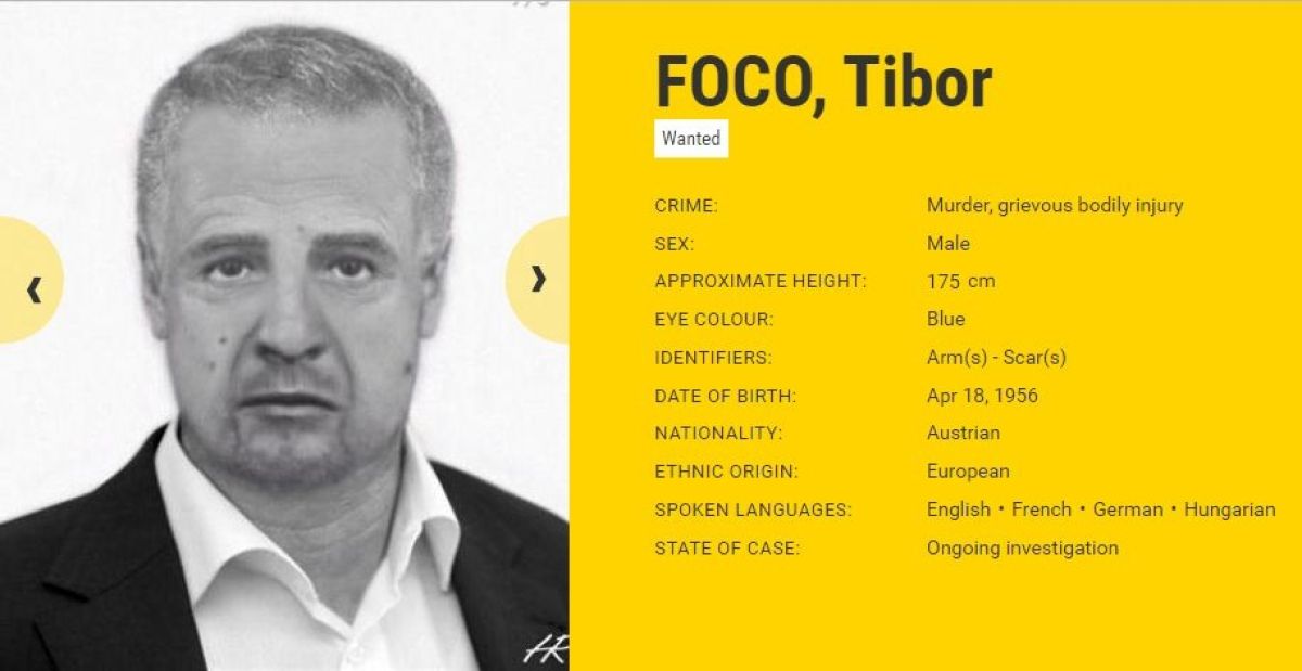 Na koledarju kriminalcev so kot prvega predstavili 60-letnega avstrijskega ubežnika Tiborja Focoja, ki ga iščejo zaradi umora prostitutke marca 1986. Na spletišču Europola (www.eumostwanted.eu) je navedeno, da je na dosmrtni zapor obsojen Foco iz zapora zbežal leta 1995. Za kakršne koli informacije, ki bi vodile do njegove aretacije, je bila razpisana nagrada v višini 2.900 evrov.