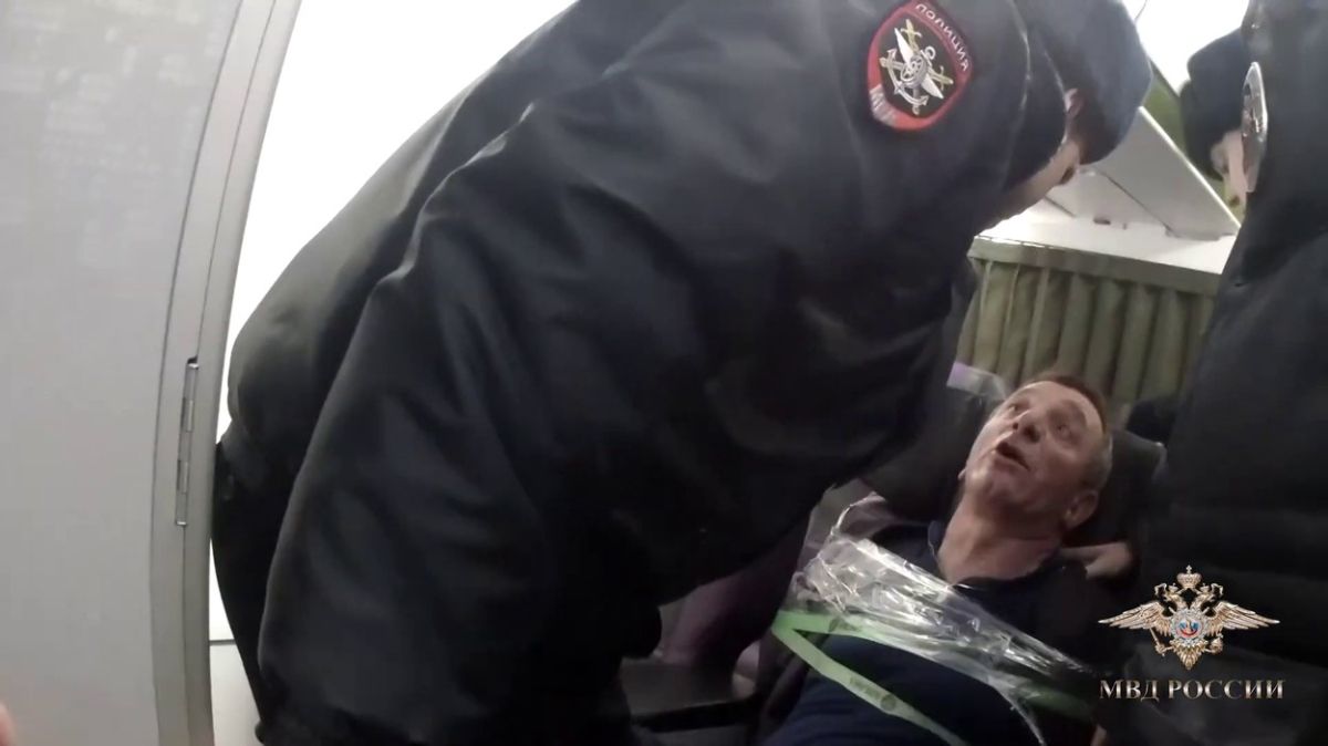 Da je »preprečila hujše posledice,« kot je pojasnila tiskovna predstavnica notranjega ministrstva, ga je morala posadka s silo onesposobiti. Uporabili so lepilni trak, ki so ga večkrat navili okoli sedeža in njegovega životca. Posadka je nato stopila v stik z letališčem v Novosibirsku in odgovornim osebam naročila, naj jih ob pristanku pričaka policija. »Ko so na krov stopili policisti, so naleteli na k sedežu zalepljenega moškega, ki je z nogami brcal v steno,« je še opisala tiskovna predstavnica. Nadeli so mu lisice in ga odpeljali na »varno.«