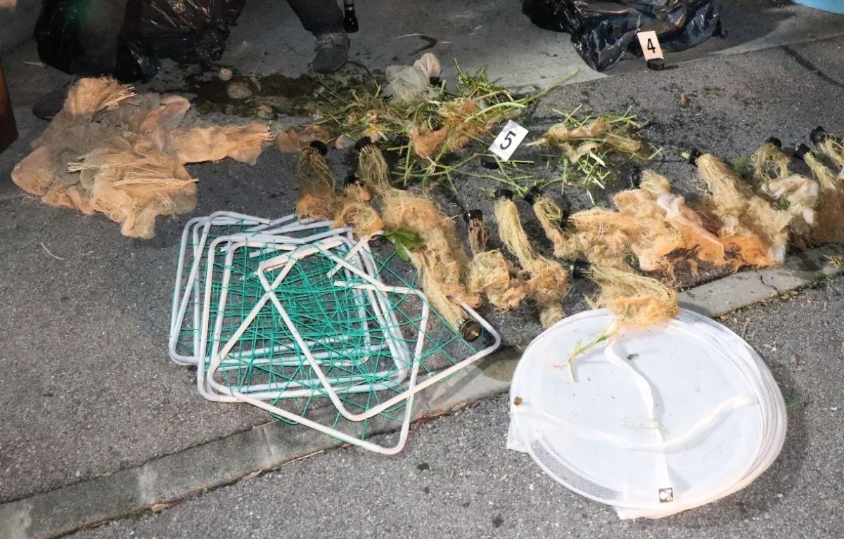 Podrobnejši ogled ekološkega otoka je razkril rastlinske delce, priprave ter pripomočke za gojenje konoplje.