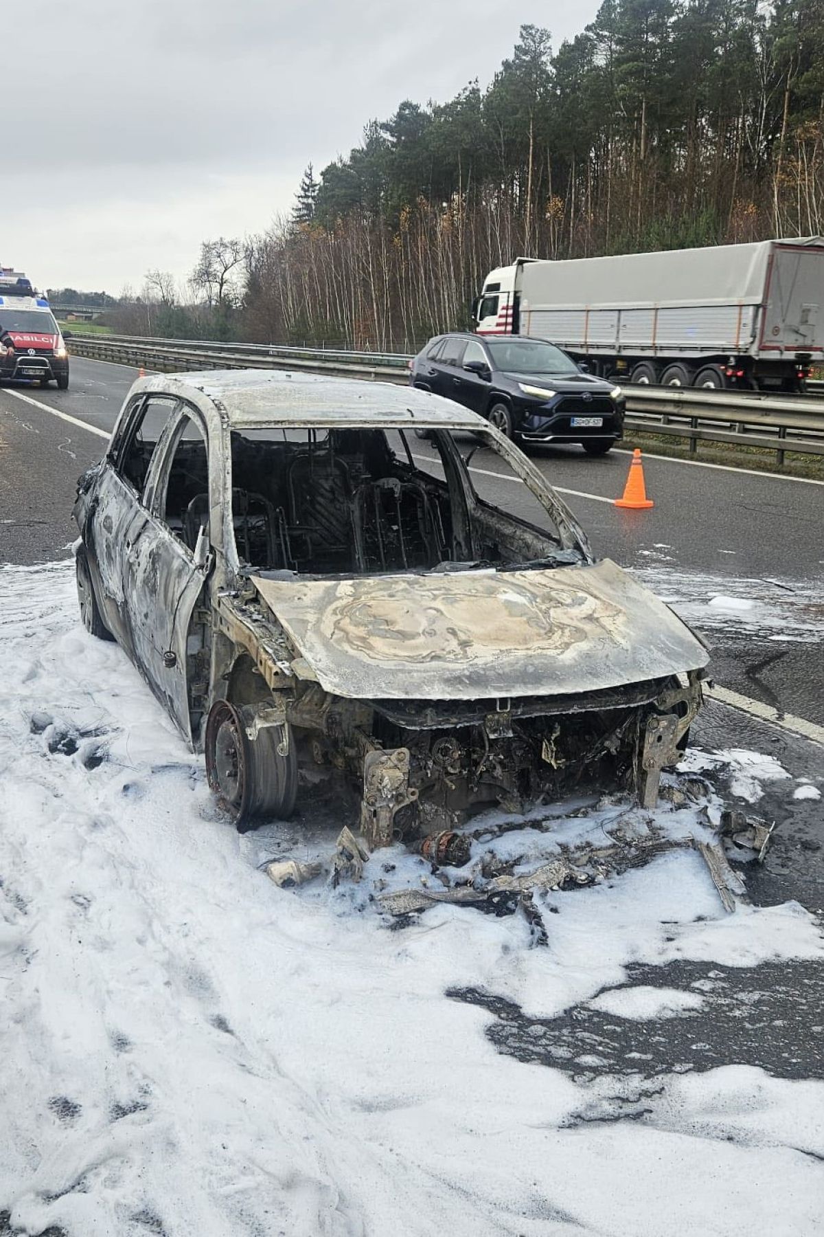 Vozilo, ki je gorelo na pomurski avtocesti, povsem uničeno