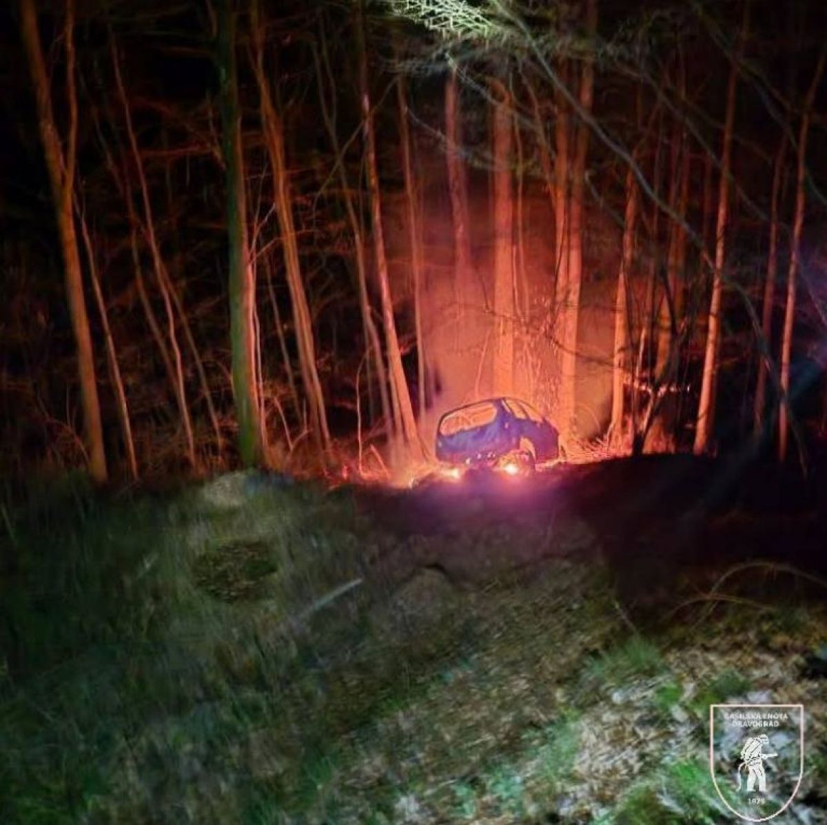 Zapeljal v grapo, avto zagorel, voznik hudo poškodovan