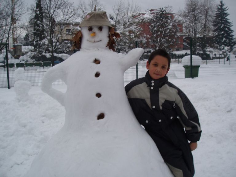 Snežna je lepa naša Domovina. Družina Fink iz Smrečnikove je obogatila okolico in naredila velikega sneženega moža - Snežaka. Največ sreče in seveda otroške radosti je pri 'gradnji' sneženega belega moža imel sin Robi, ki hodi v 3. razred Osnovne šole na Drski v Novem mestu. Mamica Sanja in sin Timotej sta tudi pomagala pri gradnji lepotca. Moje je bilo, da ko sem se sprehajal po Smrečnikovi ulici in opazoval družinsko veselje, podaril klobuk in korenček za nos in to njihovo stvaritev fotografiral in v javnost poslal. Aha, na fotografiji je tudi njihov ljubljenček - kužek Piko. V dnevni sobi.