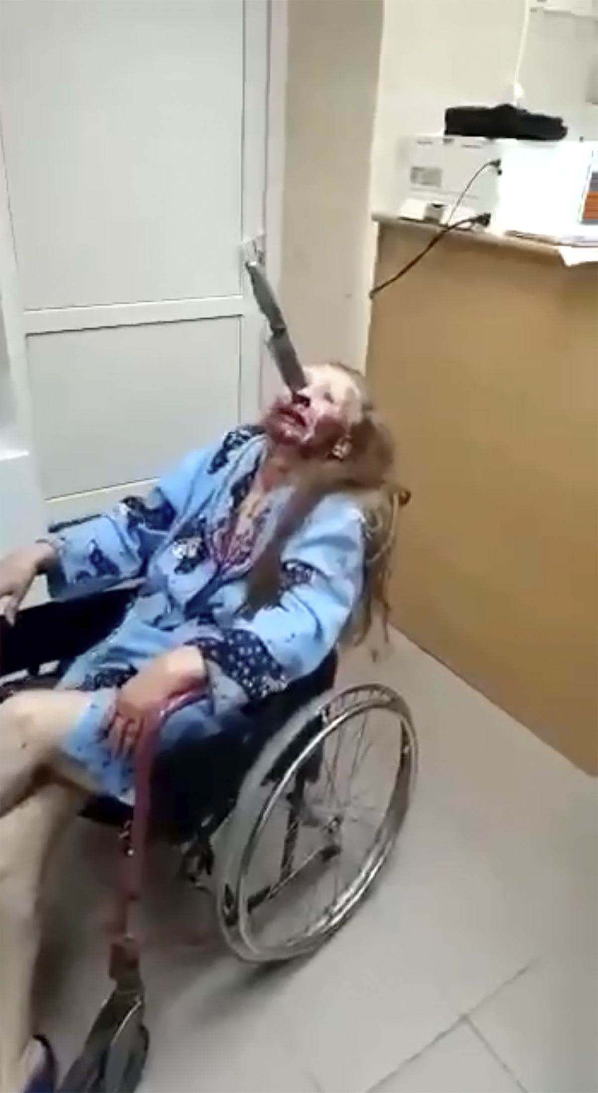 Grozljive slike prikazujejo starejšo rusko žensko, ki je čudežno preživela brutalen napad, v katerem naj bi ji mož v nos zabodel 10-centimetrski nož.
