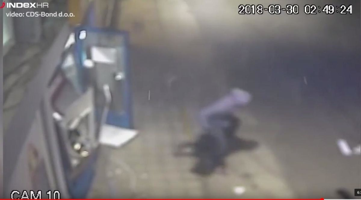 Proti koncu posnetka lahko vidimo, kako ob eksploziji raztrešči bankomat na koščke (na posnetku v 5 minuti in 32 sekundah). Za pridaniča je bistveno, da so se odprla vrata od trgovine, kar jima omogoči vstop in krajo denarja v bankomatu.