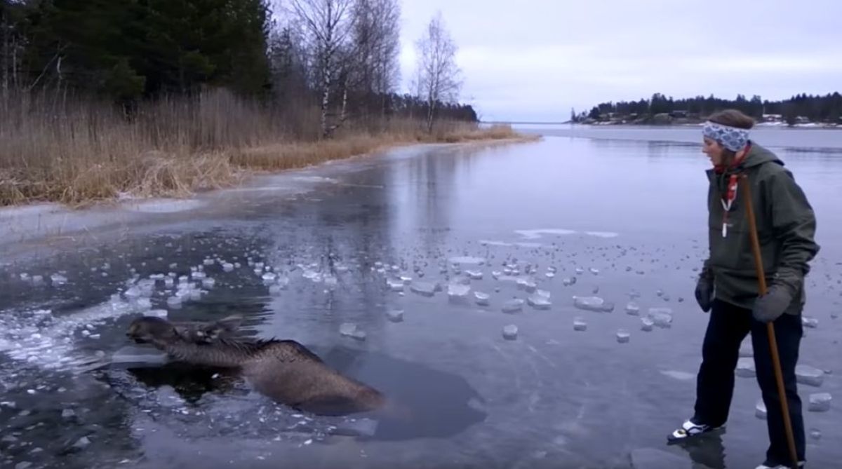 Na srečo sta bila v bližini Sigrid Sjösteen in Viktor Johannessen in njun prijatelj. S sekiro sta previdno razbila led in los utrla pot do kopnega, prijatelj pa je vse skupaj posnel.
