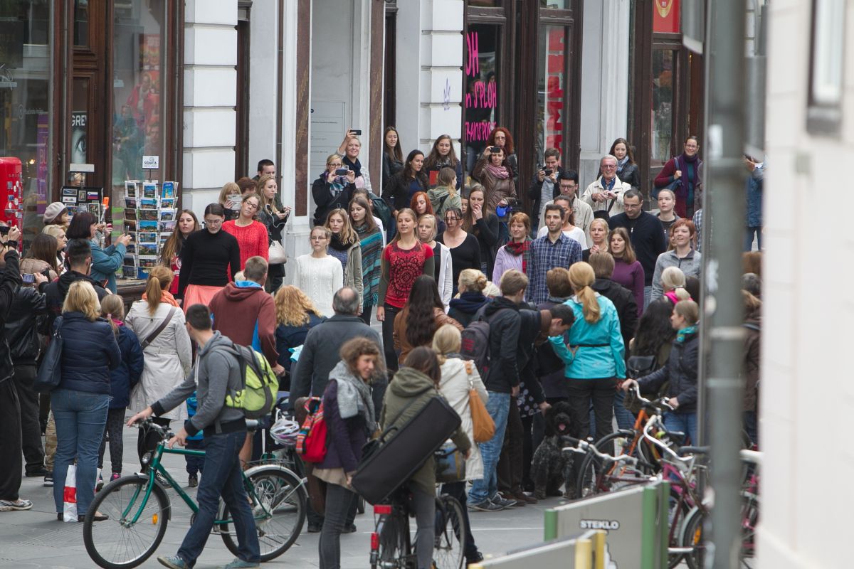 Na Čopovi ulici v Ljubljani se je najprej pojavila ena sama plesalka in požela nemalo začudenih pogledov. Kmalu se ji je pridružila še druga plesalka in že čez nekaj trenutkov so spretni plesalci irskih plesov že zasedli vso ulico. Za nekaj trenutkov je vsa ulica poskakovala v ritmu udarcev s plesnimi čevlji. Radovedni mimoidoči, ki so se zbrali okrog plesoče množice, so ulico za nekaj trenutkov naredili neprehodno, na koncu pa so plesalce pospremili z vzkliki odobravanja in bučnim aplavzom.