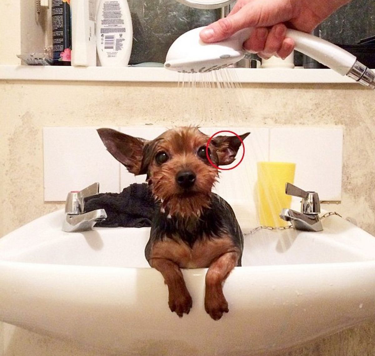 Petindvajsetletna Rachel Evans iz Walesa v Veliki Britaniji je svojega yorkshirskega terierja Davea kopala v umivalniku svoje kopalnice, nato pa naredila nekaj fotografij.