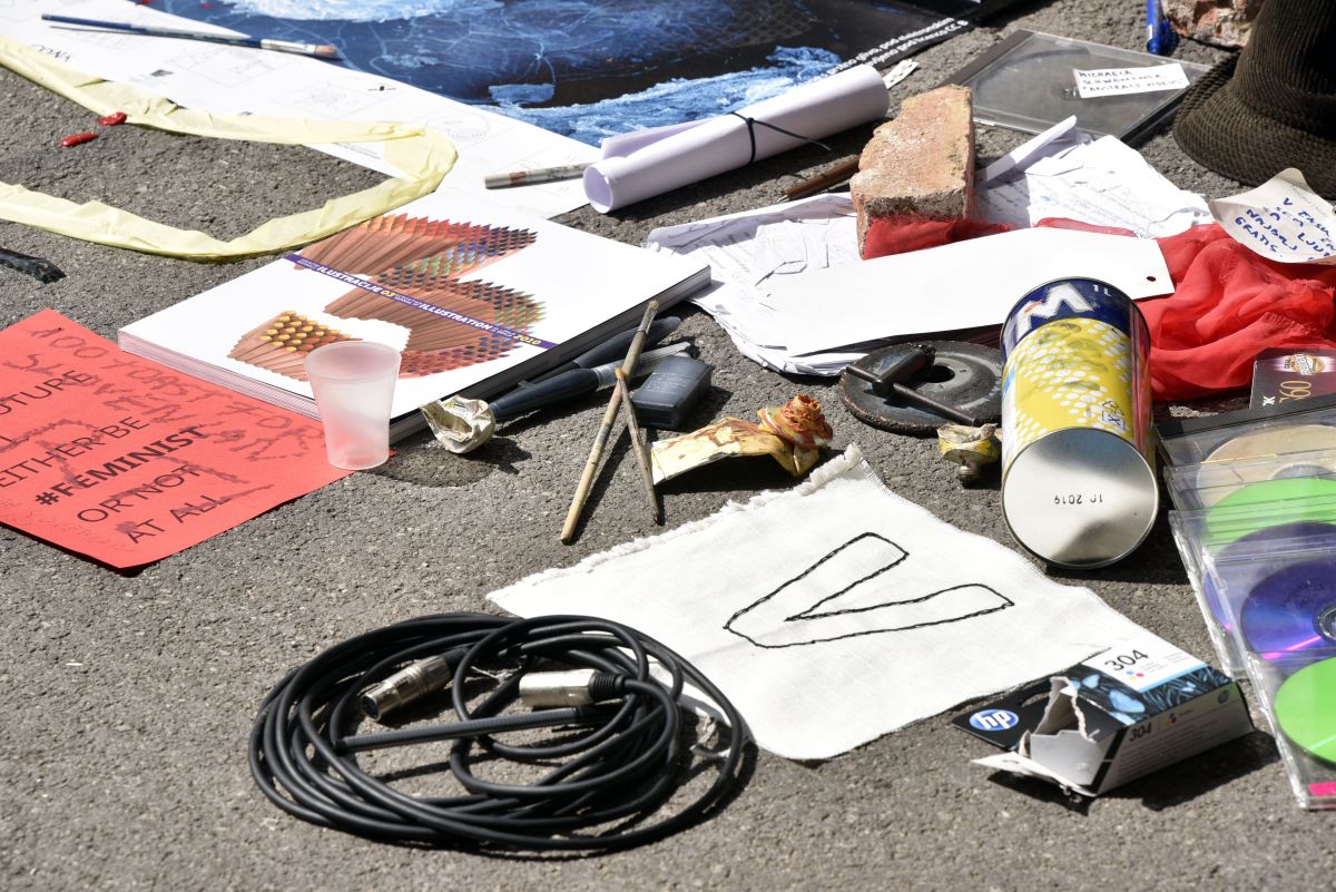 Povorka ustvarjalcev iz kulturnega, umetniškega in kreativnega sveta se je po Trubarjevi cesti podala do ministrstva za kulturo. Tam so oblikovali kolono ter posamič pred vhod ministrstva odlagali rekvizite, med katerimi je bilo opaziti več računalniških mišk, slušalke, mikrofon, slikarsko paleto, čopiče, barve, knjige, plakate, lasuljo, piščali in kose oblačil. Kot poroča portali Siol.net, so policisti na shodu legitimirali igralca Primoža Bezjaka, ki je na na vhod kulturnega ministrstva zalepil svojo obleko. Nato je igralcu v podporu krpice odvrgla še igralka Katarina Stegnar, sicer tudi članica istega igralskega kolektiva Beton Ltd.