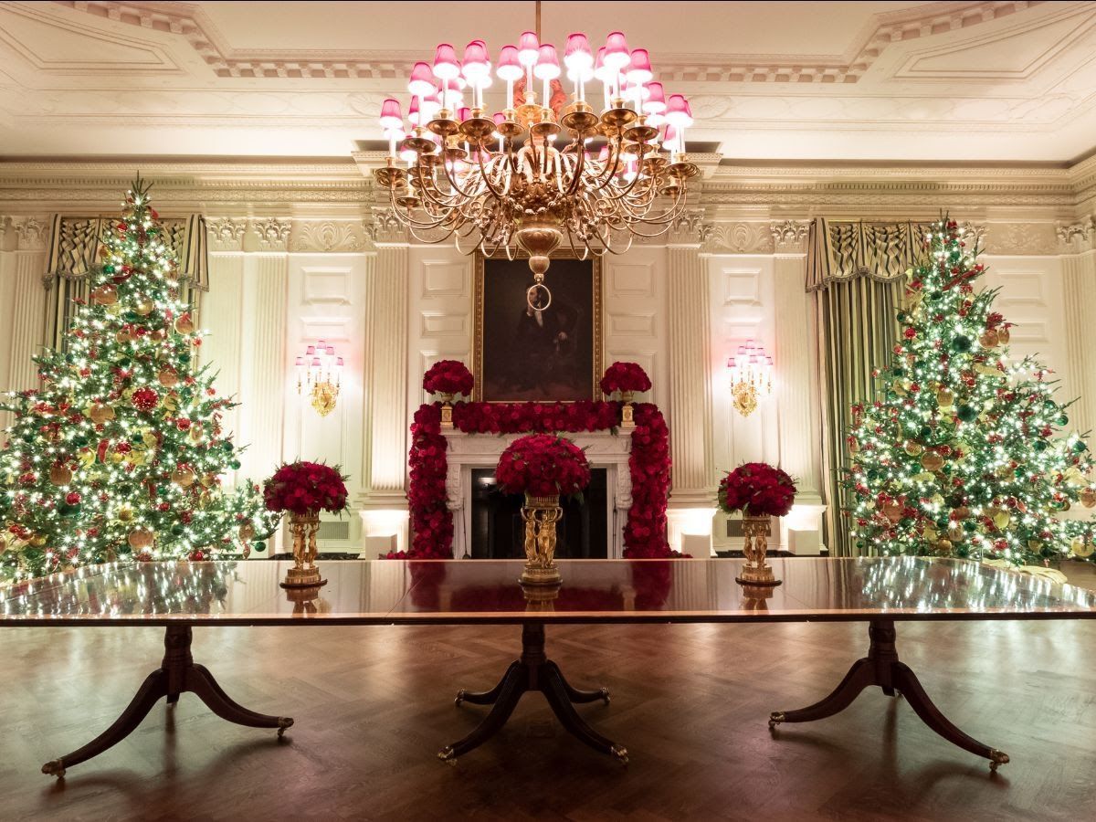 V knjižnici z okrasitvijo slavijo dediščine predsednikov, porcelanasta soba je pripravljena za praznično pojedino, državniška jedilnica z orlom na mizi pa slavi Ameriko in tako naprej.