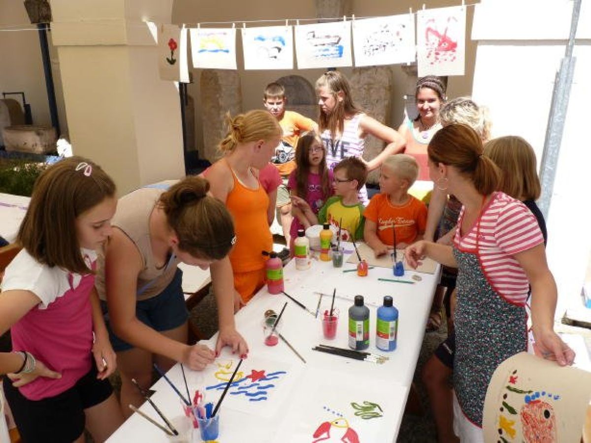 Na današnji delavnici, ki sta jo, kot bosta tudi vse ostale, vodili likovna pedagoginja in slikarka Jasmina Nedanovski in kustosinja pedagoginja Alenka Misja Zgaga, so otroci spoznavali monotipijo. Do konca avgusta pa jih čakata še linorez in suha igla.