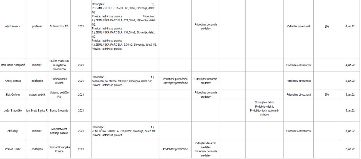 Tabela o spremembah premoženja funkcionarjev in politikov, ki jo vodi KPK.