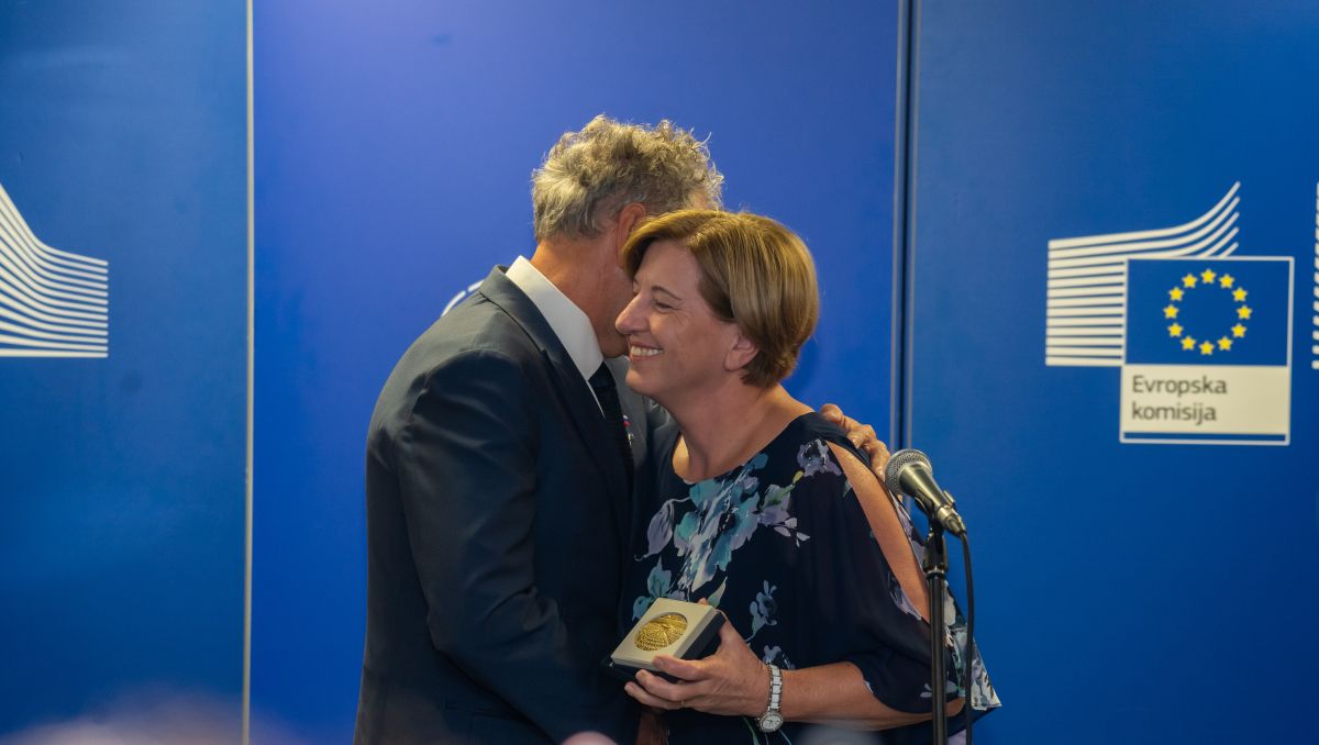 V Hiši EU v Ljubljani so danes podelili nagrado Evropskega parlamenta državljan Evrope za leto 2023, ki jo letos za projekt pomoči 120 ukrajinskim sirotam in beguncem prejme poveljnik regijskega štaba Civilne zaščite za Notranjsko Sandi Curk.