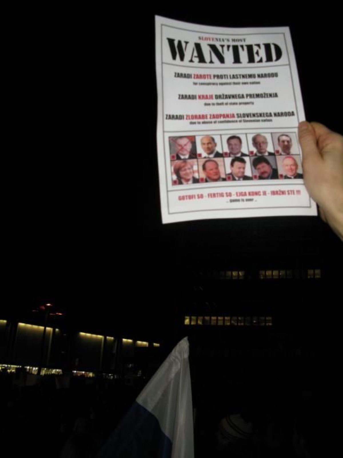 Bodite koristni, odstopite. En proračun je prazen, ne gremo še nerazen ... To so napisi le treh plakatov, ki so sinoči vihrali nad osemtisočglavo množico v Ljubljani. Ljudje so peli, skandirali, vzklikali proti Janezu Janši, Zoranu Jankoviču in vsej politični eliti, opozarjali oblast, naj nikar ne išče organizatorjev protestov, saj da smo organizatorji mi vsi ...