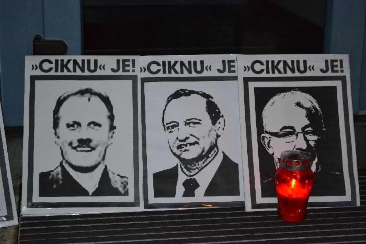 Poročali smo že o včerajšnjem protestu pred stavbo občine v Šentjerneju, na katerem so protestniki ostro nastopili tako proti visoko odmerjenem komunalnem prispevku kot proti županu občine Francu Hudoklinu in koaliciji v občinskem svetu. Svoje nezadovoljstvo so izrazili tudi na plakatih, ki pa so jih po končanem protestu namestili na ploščad pred občino, lekarno in pošto. Tako so plakati, podobe svetnikov koalicije z napisi 'ciknu je' in goreče sveče pričakali danes zjutraj tudi zaposlene na občini, protestni material je pravzaprav zapiral vhod v prostore občine. Kot smo izvedeli, ima danes župan dopust.