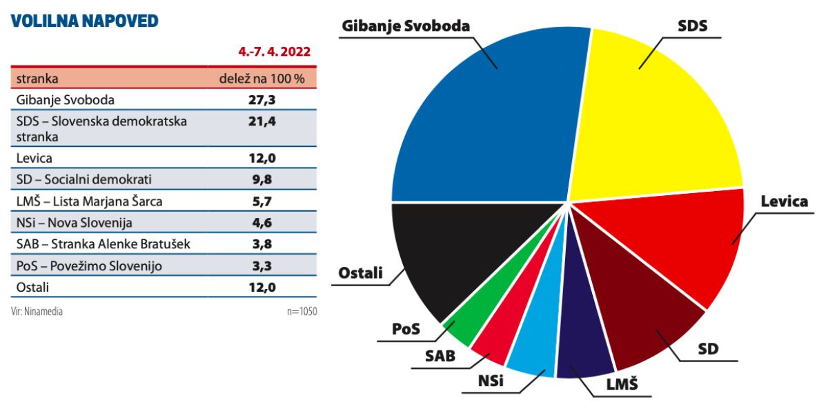 To je razvidno iz volilne napovedi, ki jo je med 4. in 7. aprilom za Svet24, Večer, Primorske novice in Dnevnik opravila agencija Ninamedia. V anketi je tako za Gibanje Svoboda glasovalo 23 odstotkov vprašanih, kar je največ v zadnjih dveh mesecih. To je verjetno posledica televizijskih soočenj, na katerih je v dneh pred anketo sodeloval Golob. Na teh se do zdaj ni pojavljal Janez Janša, predsednik vlade in SDS, za katero bi glasovalo dobrih 18 odstotkov anketiranih. To je najmanj v zadnjih dveh mesecih.