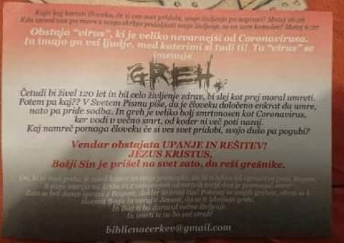 Na njem piše, da obstaja virus, ki je mnogo nevarnejši od koronavirusa. Gre za greh. "Četudi bi živel 120 let in bil celo življenje zdrav, bi slej kot prej moral umreti. Potem pa kaj??" To se sprašuje neznani avtor letaka in poudarja, da je greh "veliko bolj smrtonosen kot Coronavirus, ker vodi v večno smrt, od koder ni več poti nazaj."