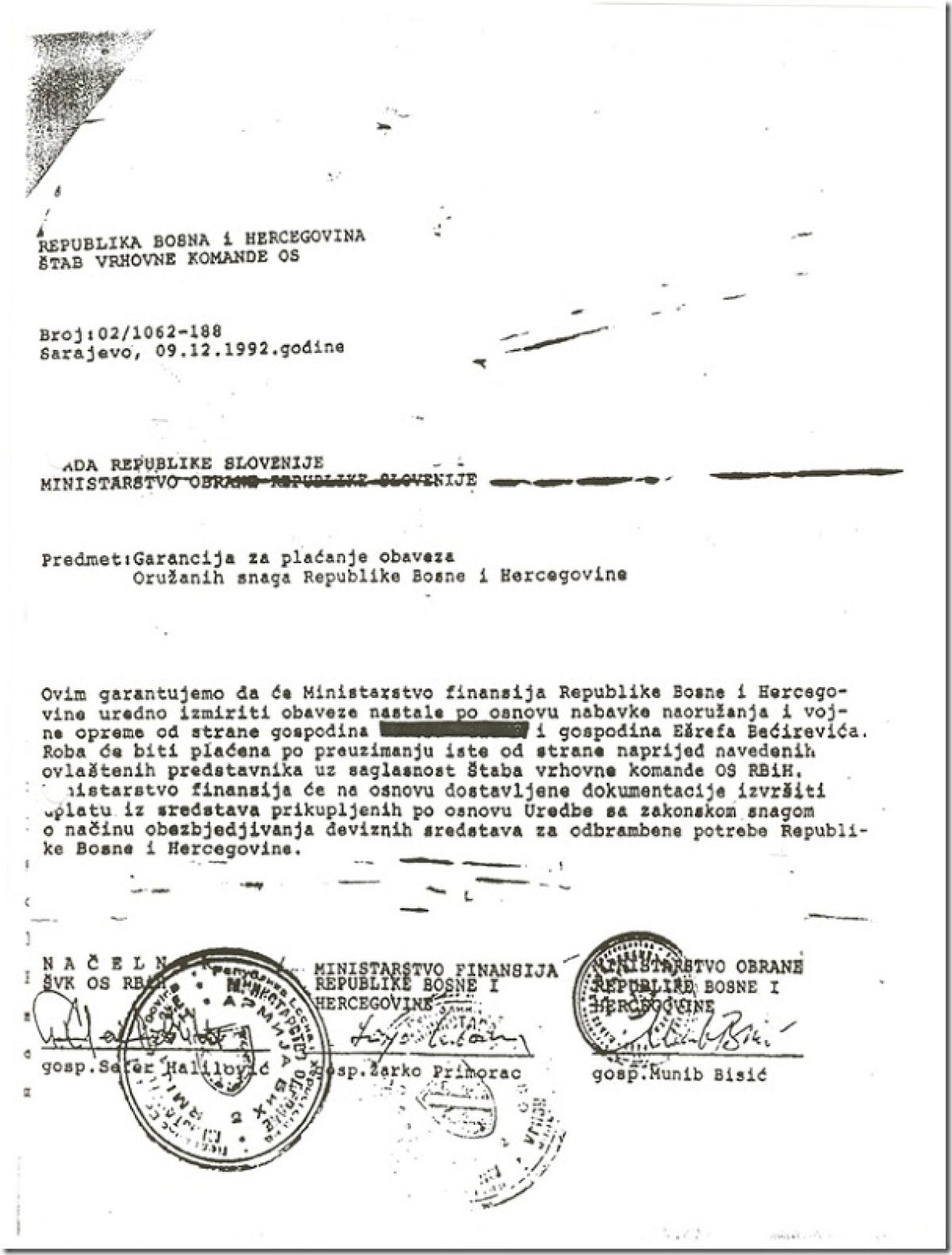 Zadnji izmed dokumentov, ki so ga pred mesecem dni na spletu objavili mediji v BiH, je garantno pismo, ki ga je vlada Bosne in Hercegovine 9. decembra 1992 poslala na slovensko ministrstvo za obrambo, ki ga je takrat vodil Janez Janša.