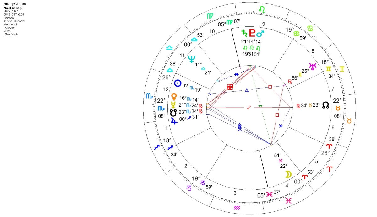 Hillary Rodham Clinton se je rodila 26. oktobra 1947 v Chicagu. Sonce je s tem v škorpijonu, toda njen horoskop ni samo to, je veliko več. Trije planeti so v 12. hiši, ki jo povezujemo z znamenjem rib, prav tam pa je tudi njena luna, torej lahko mirno govorimo o kombinaciji škorpijona in ribe. Če je kdo dober igralec, je to riba, če zna kdo dobro brenkati na strune čustev in zatiranih, je to riba, če zna kdo zlesti pod kožo volivcem, je to riba. Riba je izmuzljiva, ne moreš je prijeti, če pa ima gospa s takim potencialom še Jupitra, vladarja ribe in 12. hiše, na ascendentu, poleg tega še čisto na začetku svojega znamenja strelca (torej v izjemnem položaju!), lahko govorimo o osebi, ki ima srečo in ki se ji odpirajo vrata. Škorpijon je tu v nekakšni rezervi – če se morda kaka vrata le ne bi odprla, potem … potem to Škorpijon uredi malo drugače. To je eden od razlogov za tako velika nihanja v priljubljenosti – ali si njen privrženec ali jo sovražiš. Kako tipično za škorpijona – ali je povsem črno ali slepeče belo, vmes ni ničesar.