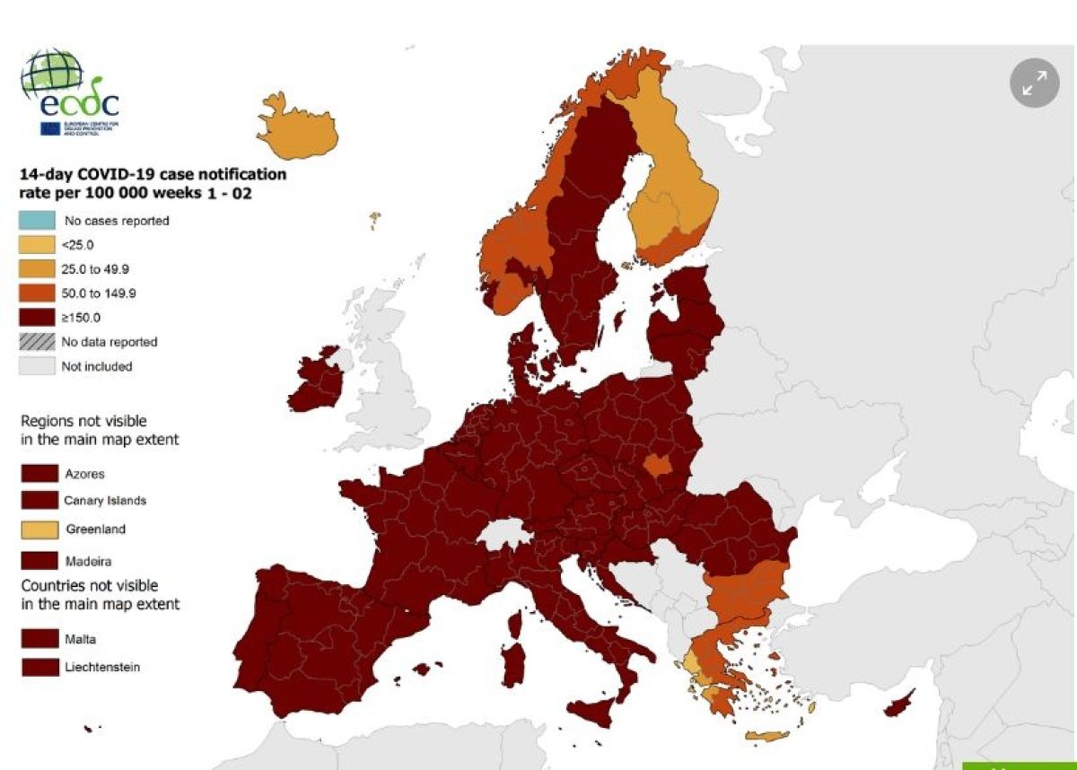 Evropski center za preprečevanje bolezni in nadzor (ECDC) je objavil zemljevid Evrope, ki naj bi bil komisiji v pomoč pri določanju temnordečih con. Če vzamemo kot kriterij 14-dnevno incidenco okužb na sto tisoč prebivalcev, je večji del Evrope, tudi Slovenija, temnordeče obarvan. Svetlo rdeča je le večina Norveške, Bolgarije in Grčije, večji del Finske pa oranžne barve.