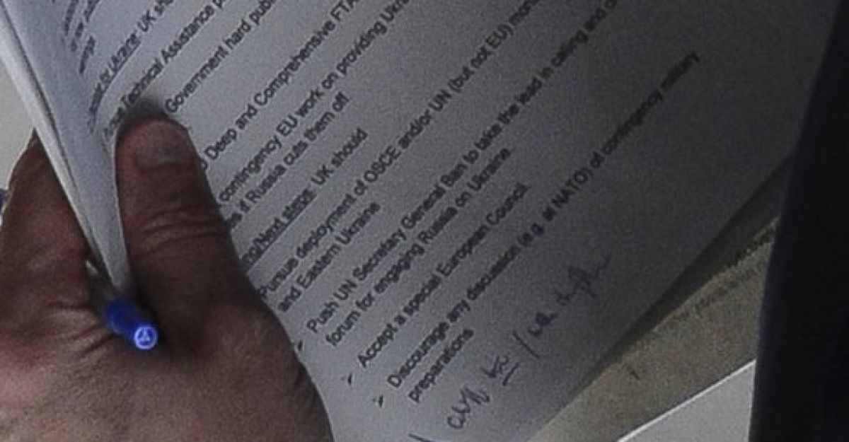 Na londonskem Downing Streetu so nastale fotografije tajnega dokumenta načrtov Velike Britanije, ki pa sankcij proti Rusiji ne vključuje.
