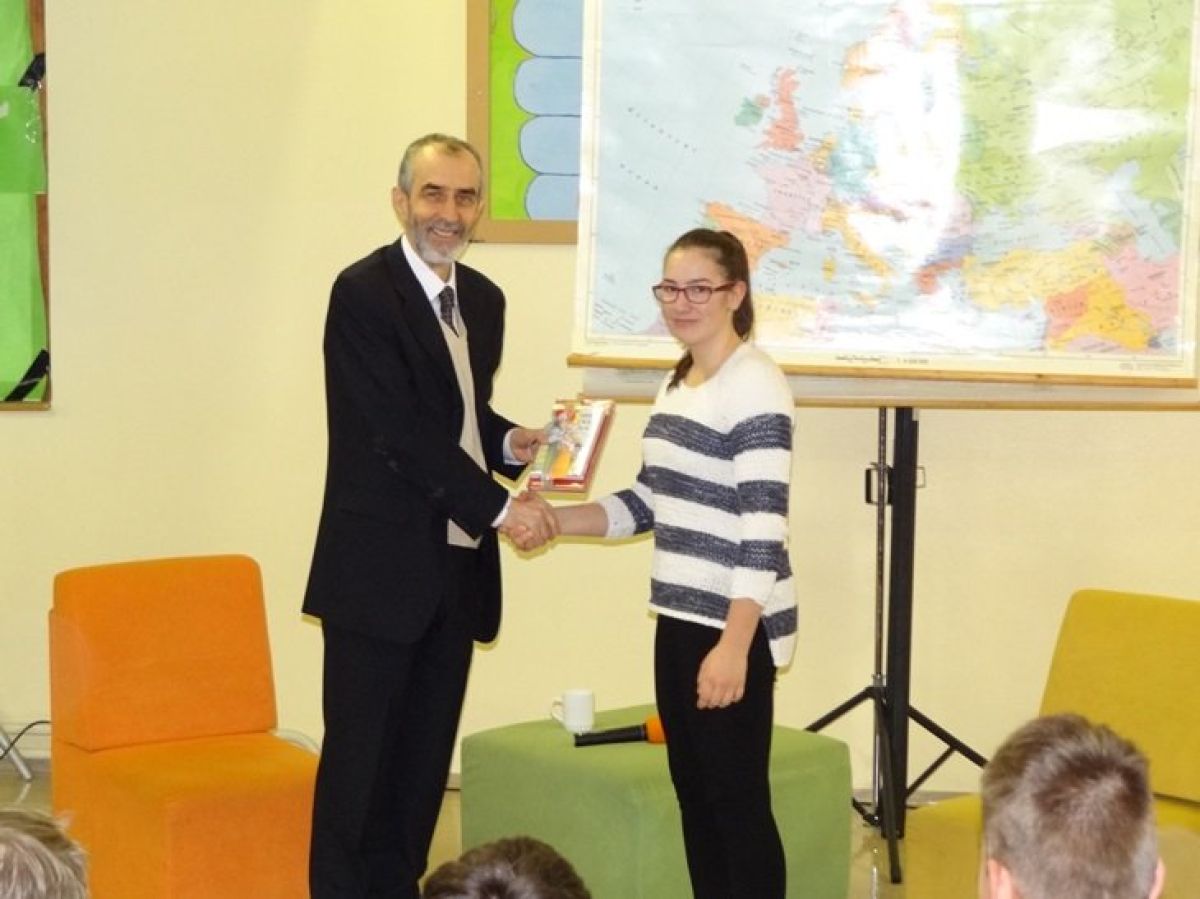 Nato se nam je gospod Jazbec pridružil še pri uri angleščine v 9. razredu. Učenci smo mu postavljali vprašanja, v angleščini seveda, on pa nam je podal zelo obširne odgovore. Kljub vsem strokovnim besedam ga ni bilo težko razumeti, saj govori zelo dobro angleško. Ura je minila zelo hitro, na koncu pa nam je podaril še dve svoji knjigi Diplomat Martin Krpan.