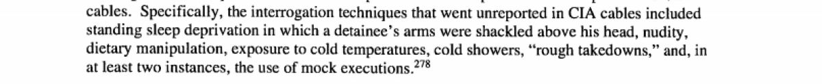 Povzetek poročila je dolg približno 500 strani, so pa cenzorji izločili nekatere detajle kot so imena ter priimki in lokacije. Uradniki CIE so se prav tako potrudili, da bi čim bolje prikrili imena 54 držav, ki so ameriški obveščevalni službi ponudile prostore za nelegalne zapore, kjer so zapornike, ki niso nikoli bili uradno obtoženi kaj šele obsojeni, nečloveško mučili, mnogokrat do smrti.