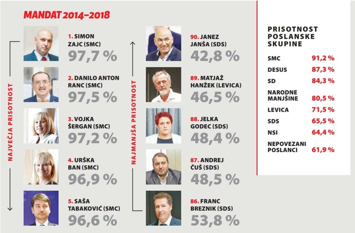 Z uporabo spletne aplikacije Parlameter smo preverili prisotnost poslancev na glasovanjih v zadnjih treh mandatih. Na glasovanjih v aktualnem mandatu državnega zbora so v povprečju najpogosteje navzoči poslanci Gibanja Svoboda in Socialnih demokratov (95 odstotkov), sledi Levica (95 odstotkov). Poslancev opozicijske SDS je v povprečju na glasovanju 73 odstotkov, poslancev Nove Slovenije pa 72 odstotkov, razkriva spletna aplikacija Parlameter.