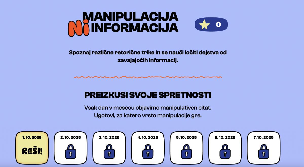 "Medijska in digitalna pismenost sta postali ključna temelja delujoče demokracije, pri čemer pa ne smeta ostati le na ravni prepoznavanja lažnih novic. Kot družba moramo razumemo tudi načine, na katere se lahko jezik in argumentacijo zlorablja za usmerjanje mnenj in doseganje političnih ciljev," so ob predstavitvi kviza pojasnili na inštitutu. Dodali so, da želijo javnosti ponuditi praktično in zabavno orodje, s katerim lahko razvijajo kritično presojo vsebin, ki so jim izpostavljeni vsak dan.