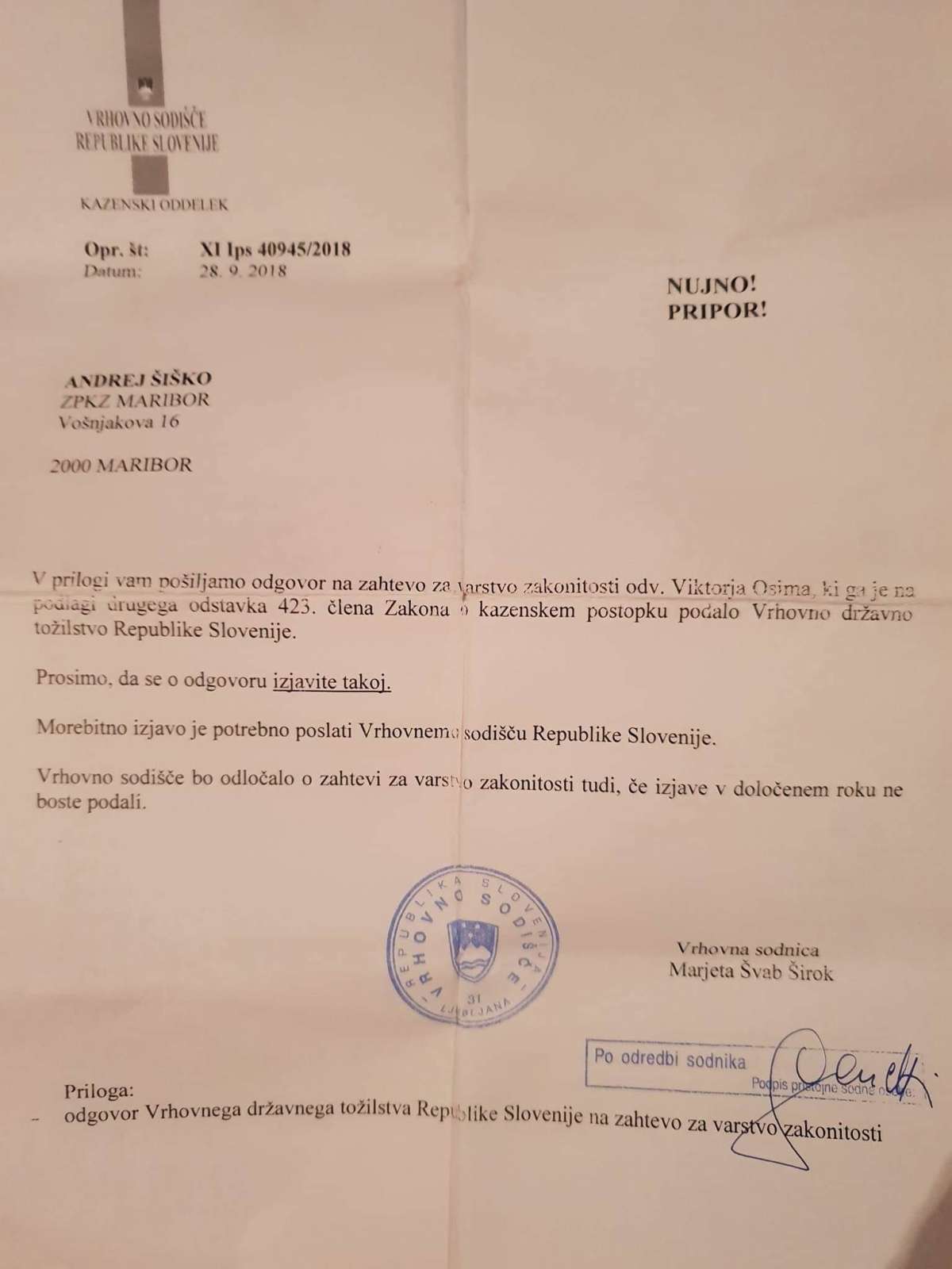 Vrhovna sodišče v Ljubljani bo že v kratkem obravnavalo zahtevo za varstvo zakonitosti, ki jo je v primeru pripora za Andreja Šiška vložil Šiškov zagovornik Viktor Osim. Svoje mnenje o zadevi je v imenu vrhovnega državnega tožilstva podala tudi vrhovna tožilka svetnica Barbara Brezigar.