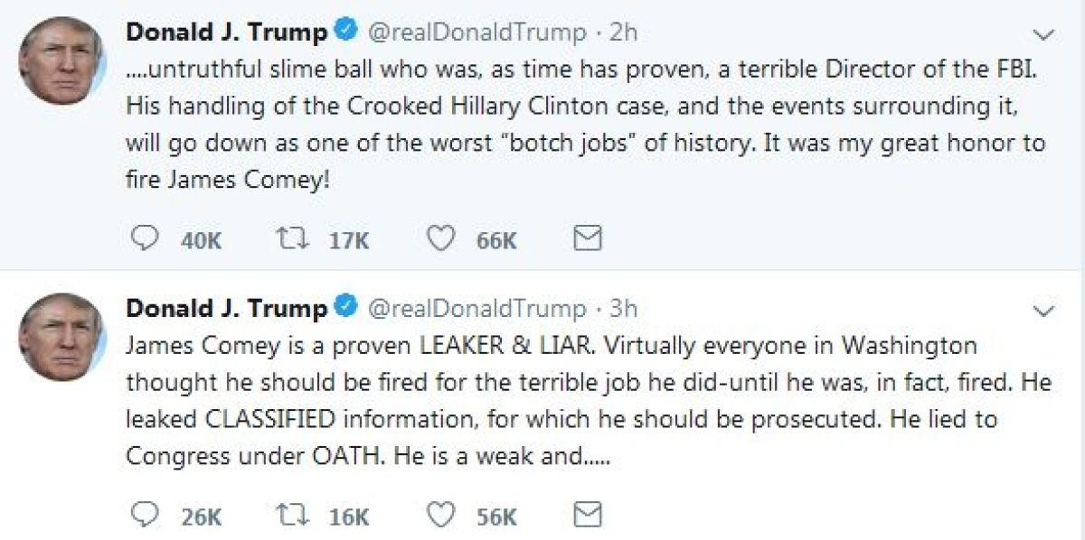 Comeyja je opredelil kot šibkega in lažnivega sluzavca, ki je bil slab direktor FBI. Med drugim zaradi vodenja preiskave proti "pokvarjeni" Hillary Clinton. "Bilo mi je v veliko čast, da sem odpustil Jamesa Comeyja," je poudaril Trump.