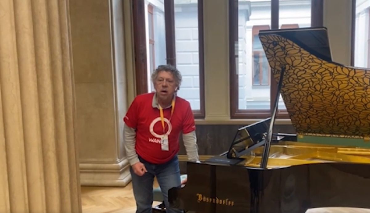 VIDEO: Avstrijski upokojenec se je v parlamentu protestno prilepil na zlat klavir