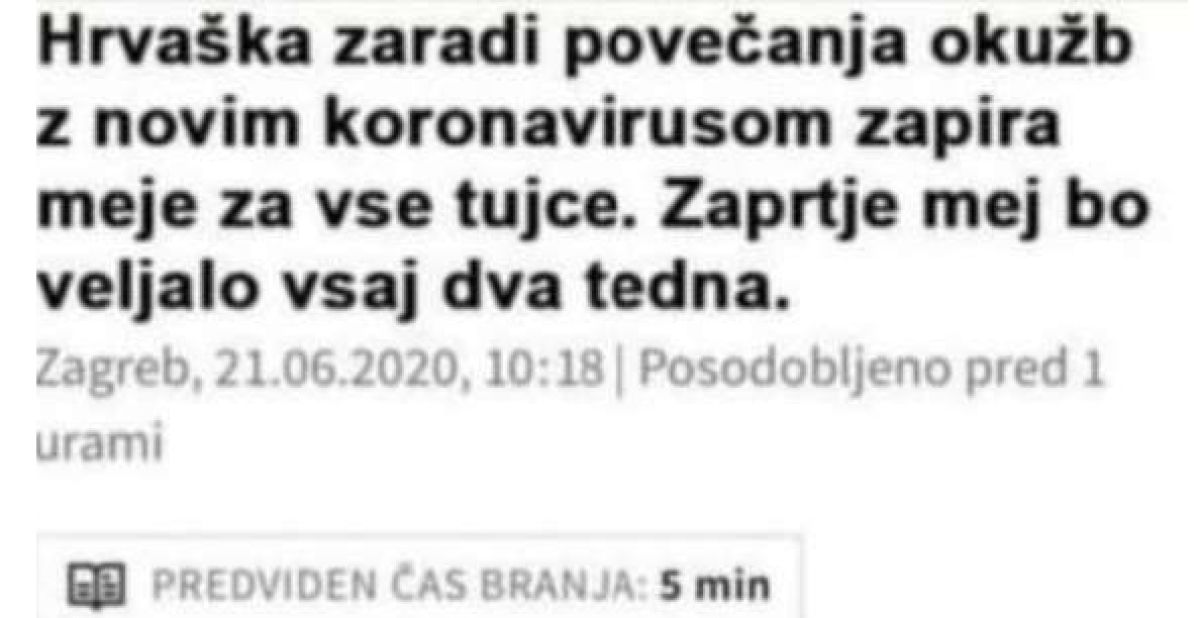 Omenjena lažna novica nosi naslov "Hrvaška zaradi povečanja okužb z novim koronavirusom zapira meje za vse tujce. Zaprtje mej bo veljalo vsaj dva tedna." Lažna novica vizualno imitira izgled novice na portalu 24ur.com, kot avtorja pa navaja STA.