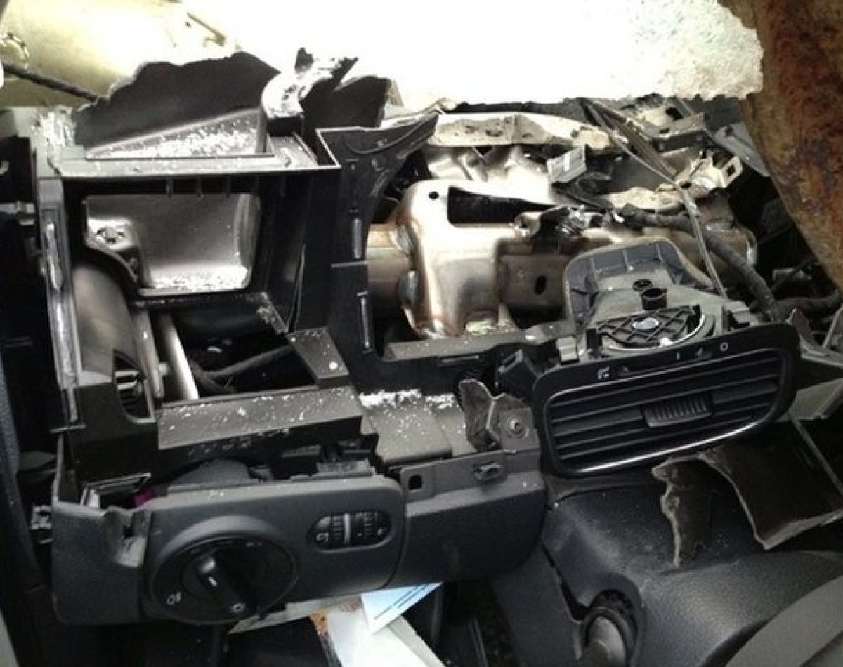 Po pričevanju očividcev se je vse skupaj zgodilo tako hitro, da voznik ni imel časa reagirati. Nenadoma je skozi vetrobransko steklo priletela gmota železa in popolnoma 'razmesarila' armaturno ploščo in tudi nekoliko poškodovala voznika. Na srečo ta v nesreči ni umrl, po fotografijah sodeč, pa je moral biti udarec izredno silovit.