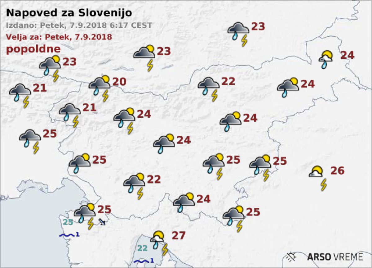 Danes popoldne bo sicer še spremenljivo do pretežno oblačno. Krajevne padavine in deloma tudi nevihte se bodo iz zahodne Slovenije razširile na večji del države. Temperature bodo od 20 do 26 stopinj Celzija.