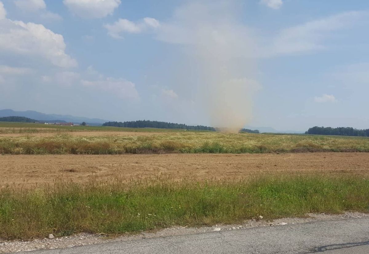 Na polju med Brnikom in Vodicami je danes poplesaval prašni vrtinec oziroma dust devil.