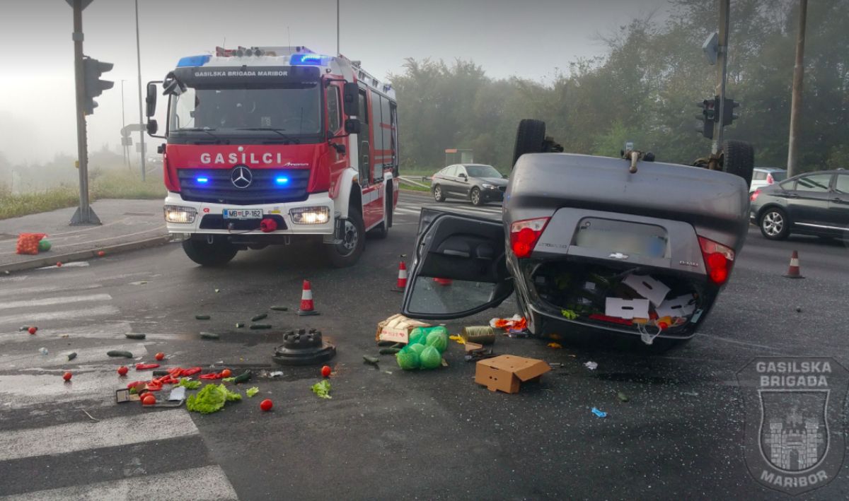 Gasilci GB Maribor so včeraj okoli 8.30 posredovali na Tržaški cesti v Mariboru. Trčili sta dve vozili, eno od teh pa je pristalo na strehi. Gasilci so avtomobil postavili nazaj na kolesa ter poskrbeli za vse ostale nujne ukrepe.