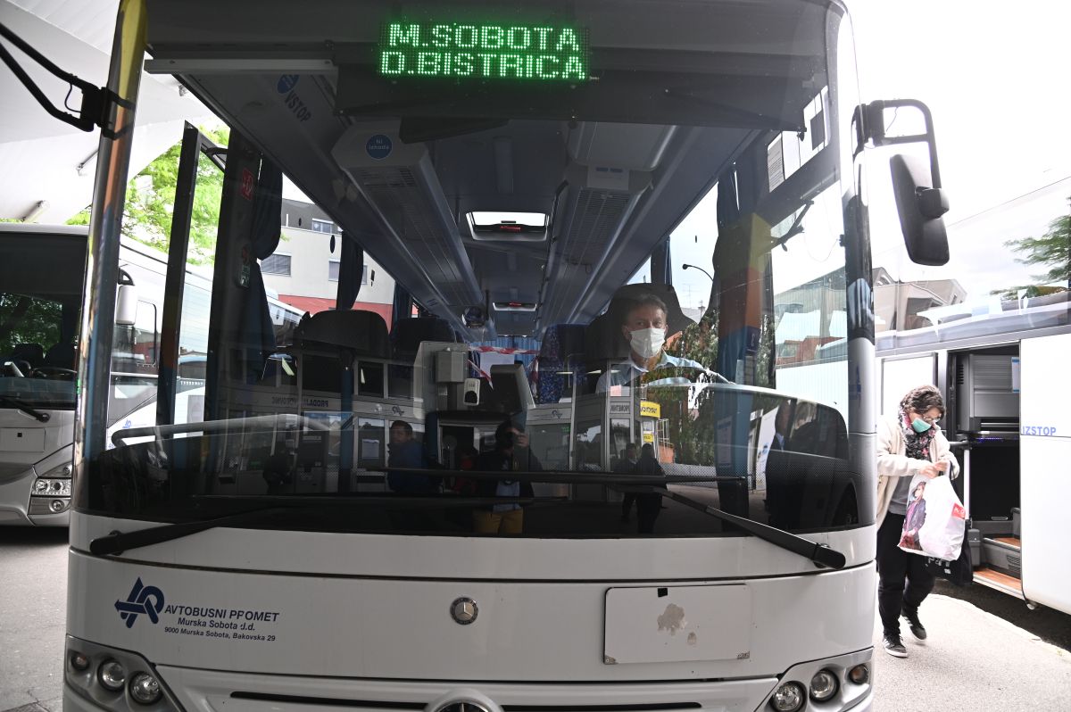 V Pomurju je danes ponovno stekel javni potniški promet, ki je zaradi obvladovanja epidemije novega koronavirusa obstal 16. marca. Ob vnovičnem zagonu morajo potniki spoštovati več zaščitnih ukrepov, med drugim morajo ob vstopu v vozilo razkužiti roke, med vožnjo pa nositi zaščitno masko. Fotografije Nataša Juhnov.