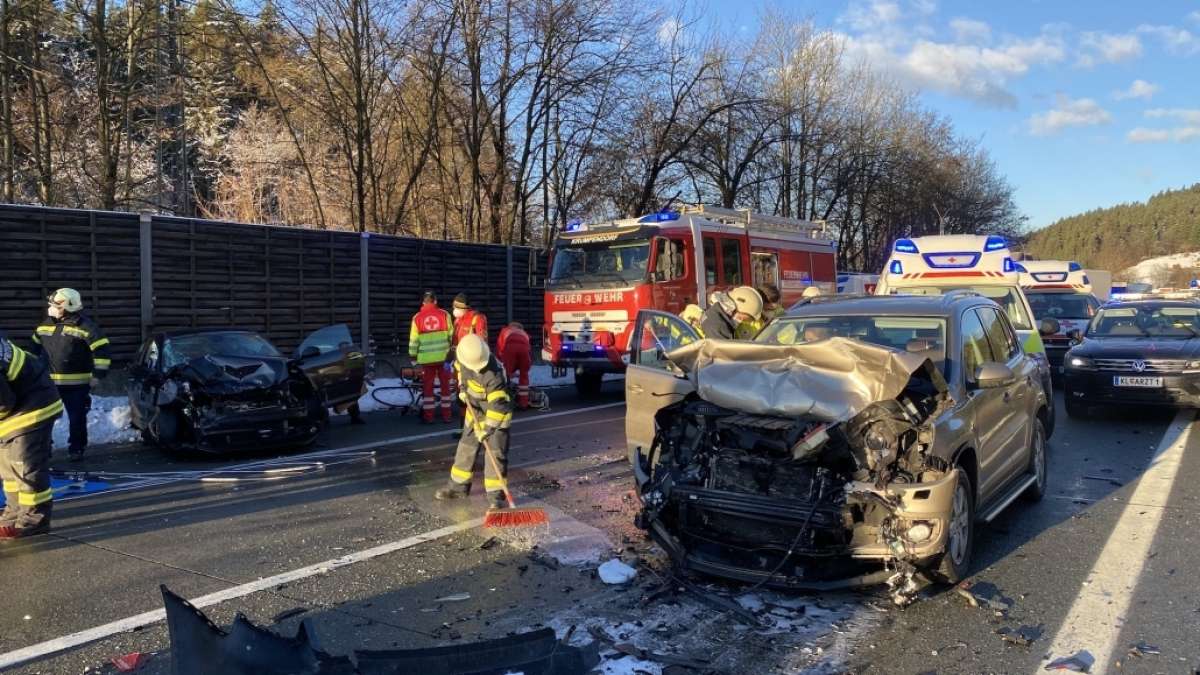 Avtocesta v bližini Pörtschacha, dvojezične občine ob Vrbskem jezeru nedaleč od Celovca, je bila danes dopoldne prizorišče hude prometne nesreče, v kateri se je po zadnjih informacijah poškodovalo osem oseb, od tega štiri huje.