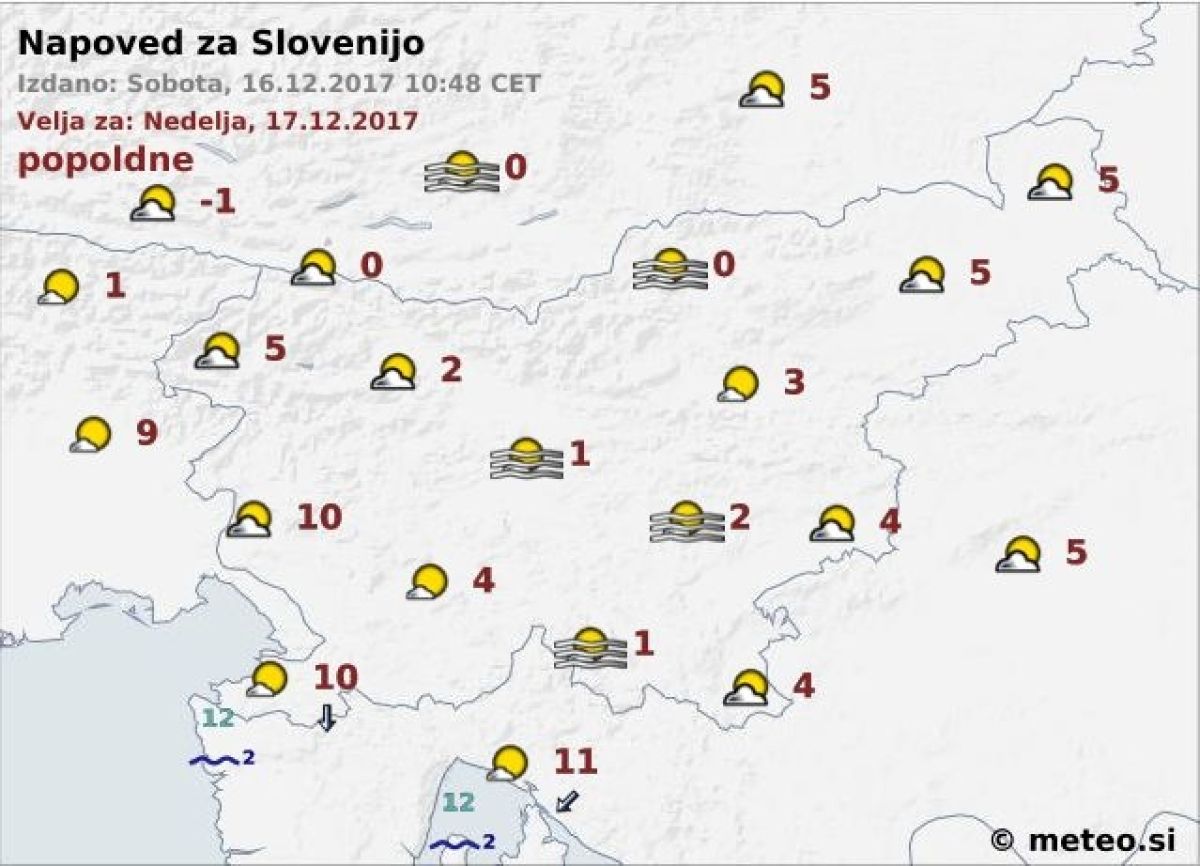 Meteorologi napovedujejo, da se bo popoldne od severozahoda počasi pričelo jasniti. Na Primorskem bo pihala šibka burja. Najvišje dnevne temperature bodo od 0 do 5, na Primorskem okoli 10 stopinj Celzija. Ponoči se bo zjasnilo, ponekod po nižinah bo nastala megla. V nedeljo bo večinoma sončno z občasno zmerno oblačnostjo. Po nekaterih nižinah se bo zadrževala megla. Najnižje jutranje temperature bodo od -8 do -2, ob morju malo nad 0, najvišje dnevne od 0 do 5, na Primorskem do 10 stopinj Celzija. V ponedeljek bo sprva precej jasno, sredi dneva in popoldne pa se bo oblačnost od zahoda povečala. Po kotlinah osrednje Slovenije se bo zadrževala megla.