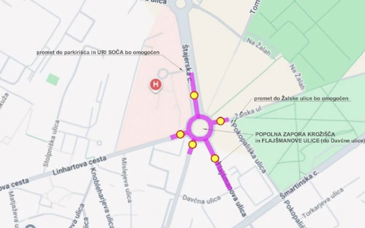 Zaradi nadaljevanja rekonstrukcije bo danes in v sredo za ves promet zaprto krožišče Žale.